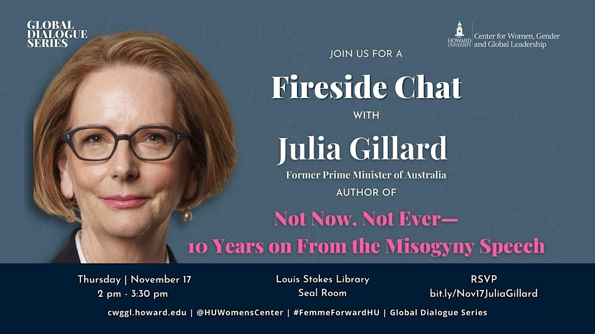 Join us on November 17 as we welcome former Prime Minister of Australia Julia Gillard for our final Global Dialogue Series of the semester. She will discuss her latest book 'Not Now, Not Ever - 10 Years on From the Misogyny Speech,' in a fireside chat with Dr. J. Dawuni, Director of CWGGL.