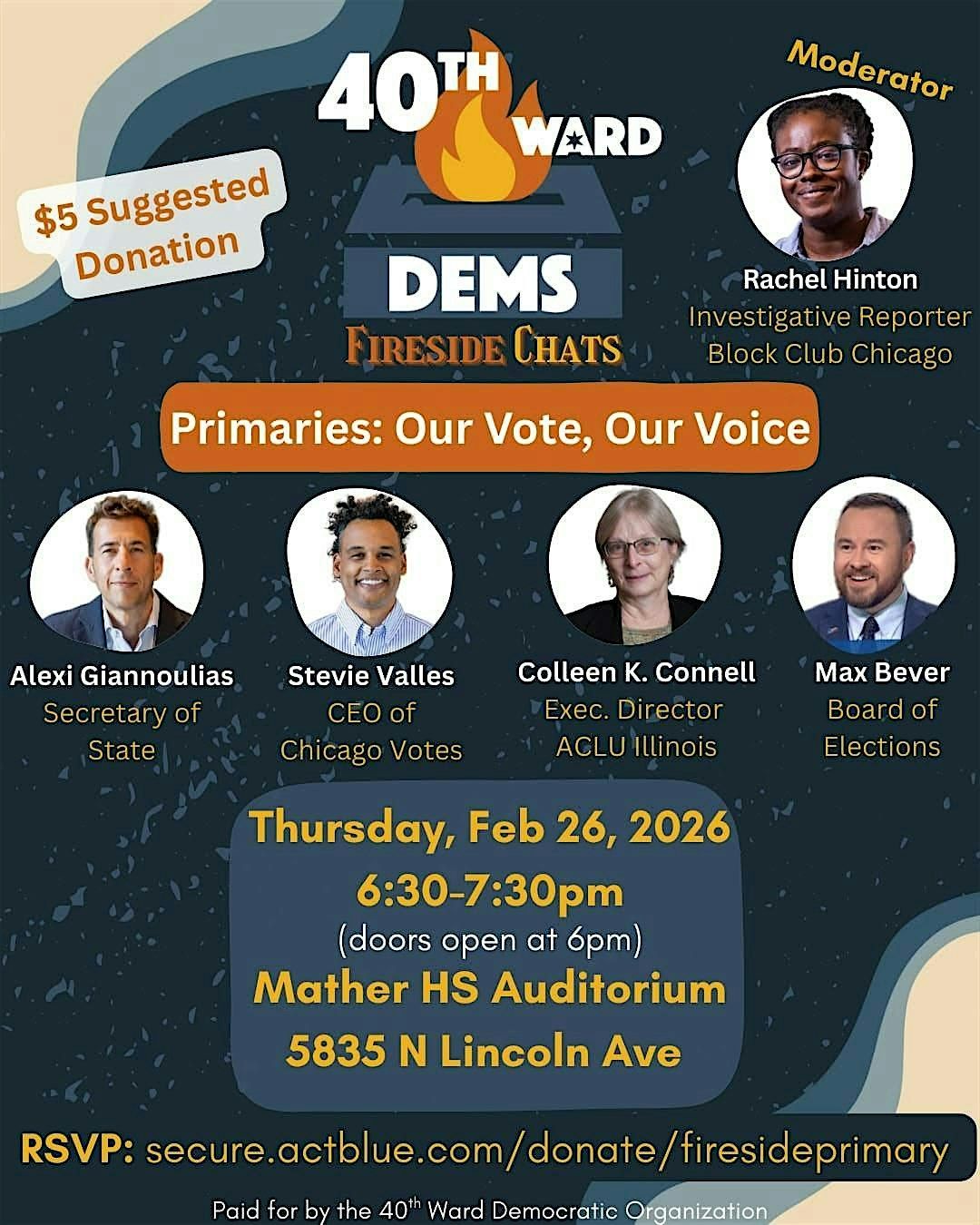 Join the 40th Ward Dems on Thursday, February 26, at Mather High School for our first Fireside Chat -- a moderated panel discussion on primary elections, featuring: