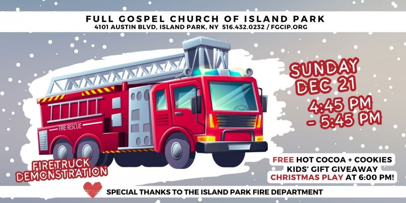 Don't miss your chance to climb aboard a shiny, red firetruck and take pics with the family on Sunday, December 21st from 4:45 PM - 5:45 PM at Full Gospel Church of Island Park, 4101 Austin Blvd. We'll have a kids' gift giveaway* and complimentary hot cocoa with the cast, too.
