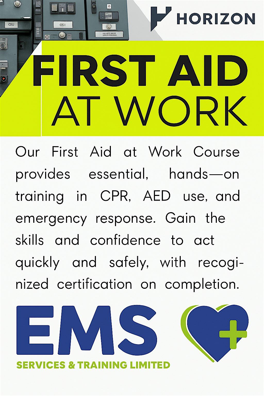 Our First Aid at Work course is running 30th March – 1st April, delivered in partnership with EMS — ensuring high-quality, accredited training.Over three comprehensive days, you’ll gain practical, hands-on experience in: CPR & AED use Managing workplace injuries and medical emergencies Effective emergency response proceduresOn completion, you’ll receive certification to keep your workplace compliant, confident, & prepared. 30th March – 1st April Delivered in partnership with Emergency Medical Supplies, Services & Training Ltd. Limited spaces availableBook now to secure your place.
