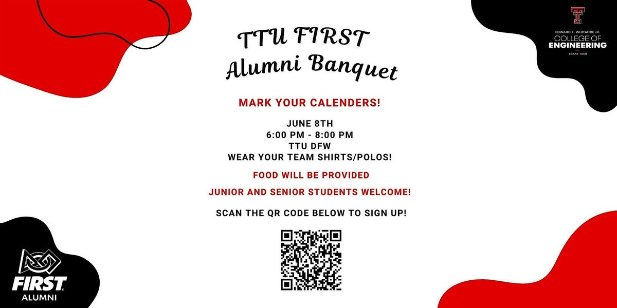 Are you a FIRST Alumni? Come join us at our FIRST Alumni Banquet event provided by the Texas Tech - College of Engineering Outreach Department, taking place at TTU DFW from 6:00 - 8:00 PM, June 8th! This event is for current FIRST Tech Challenge and FIRST Robotics Competition alumni in the DFW area, and/or helping out with the Cowtown FTC Premier Event! High school students who are juniors or seniors are also welcome to attend!