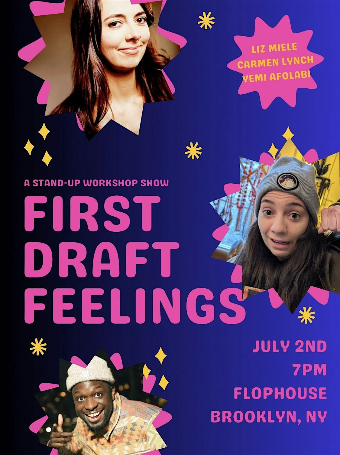 3 comedians try out new jokes while giving notes, tags and telling stories. This show features Liz Miele, Carmen Lynch and Yemi Afolabi