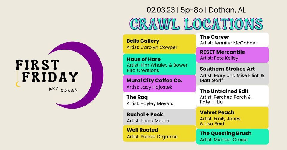 It's that time of the month again! Friday, February 3rd, from 5p-8p, is Dothan's next First Friday Art Crawl! This month we are launching an Art Crawl Scavenger hunt -- if you visit all the locations, you can win a giant gift basket full of goodies from every participating location!What's a First Friday Art Crawl? On the first Friday night of EACH month, local businesses will host artist pop-ups, exhibit openings, art activities, and art demonstrations for the public.
