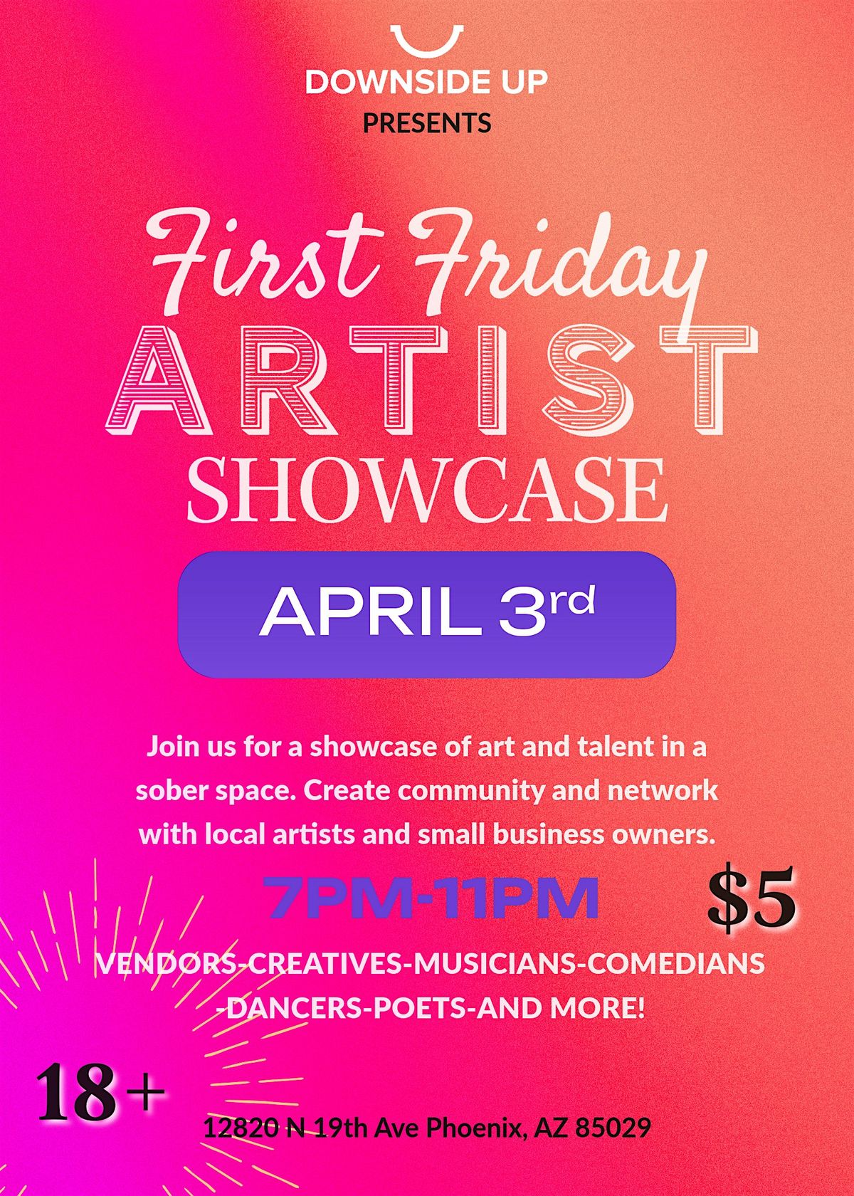 Join us in person for the First Friday Artist Showcase! It's a sober and chill night packed with amazing local art, good vibes, and a chance to meet some super talented creators. Whether you're an art lover or just looking for something fun to do, this event's got you covered. Swing by, soak in the creativity, and support the arts community. Can't wait to see you there!
