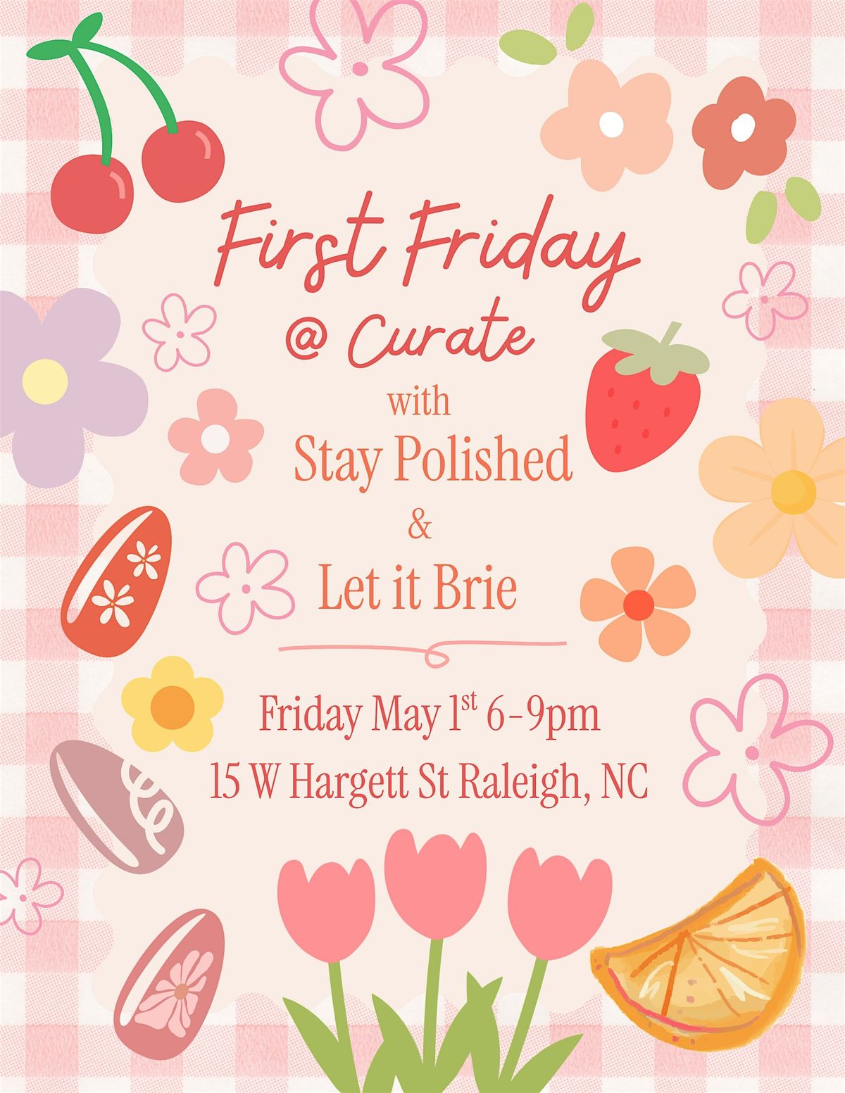 Join us Friday May 1st from 6-9pm at Curate for a First Friday event with Stay Polished and Let it Brie. Stay Polished will be set up with a custom press on station to get your nails ready for spring time fun! Let It Brie will also have delicious snacks available for you to enjoy. Stop by for a spring refresh and shop our collection of over 40 local vendors. We can't wait to celebrate with you!