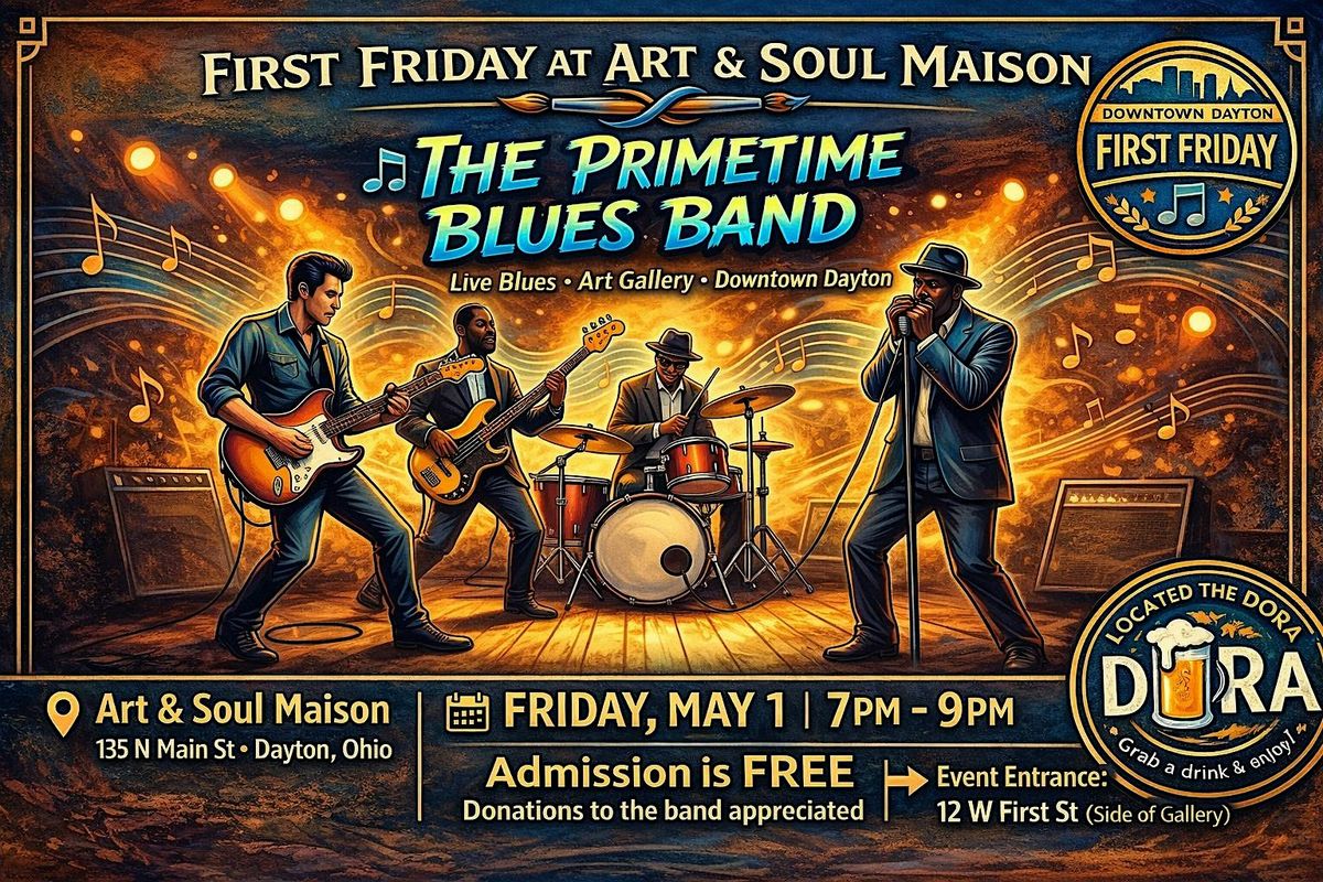 Join us in downtown Dayton for an evening of live blues music, art, and community during First Friday! Art & Soul Maison welcomes The Primetime Blues Band for a high-energy performance in our gallery event space.Enjoy a night filled with soulful blues while surrounded by incredible art in one of downtown’s most unique creative spaces. We’re located in the DORA District, so feel free to grab a drink from a participating nearby establishment and bring it along while you enjoy the music.