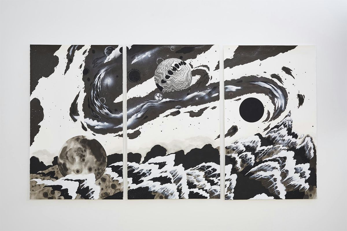 an observatory, a temple, and a queer sacred space. The work explores the visual language of the cosmos, employing sumi and fluorescent inks alongside the luminosity of projected light to evoke a space that hovers between the flatness of surface and the depth of the universe. This shifting dimensionality gently destabilizes the viewer’s sense of gravity and scale.