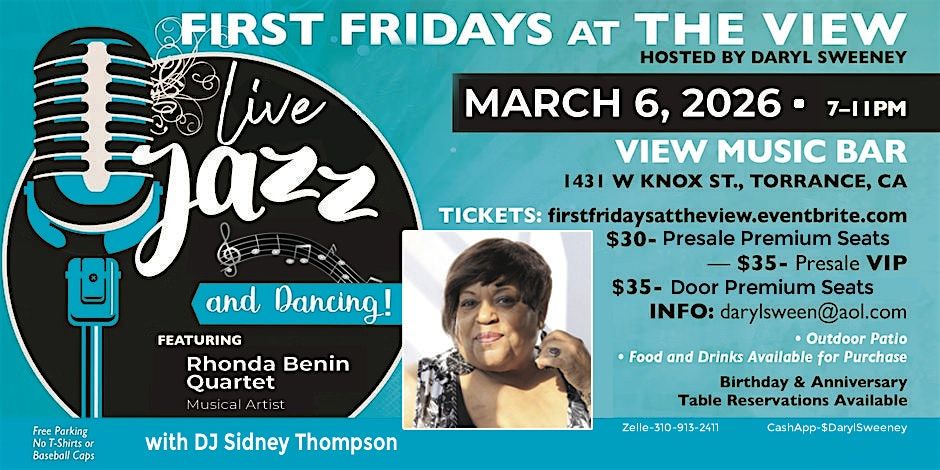 First Fridays at the View is where grown folks come to listen to live jazz, dance and have a great time. Our featured artist for March is "The Rhonda Benin Quartet". San Francisco Bay Area vocalist, Rhonda Benin has earned a reputation for not just a good voice but showmanship, magnetic stage personality, humor, and of course her great dancing.