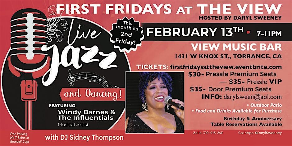 First Fridays at the View is where grown folks come to listen to live jazz, dance and have a great time. Our featured artist for February is "Windy Barnes & The Influentials". Windy Barnes is a world-class vocalist whose luxurious, sensuous sound transcends genres—gliding effortlessly from jazz to pop, R&B, and gospel. With a voice that’s been called “heavenly” by Julio Iglesias himself, Windy has become one of the most sought-after performers across the globe.