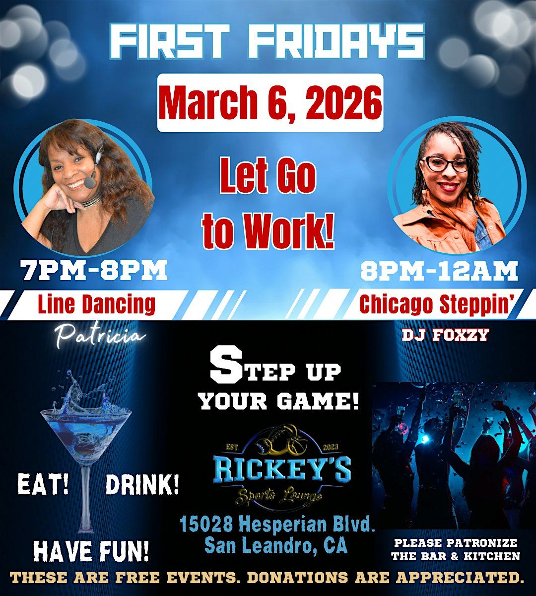 First Fridays at Rickey’s! Line Dancing 7–8PM, Chicago Steppin’ 8PM–12AM. Free event—eat, drink & step up your game! March 6About this Event
