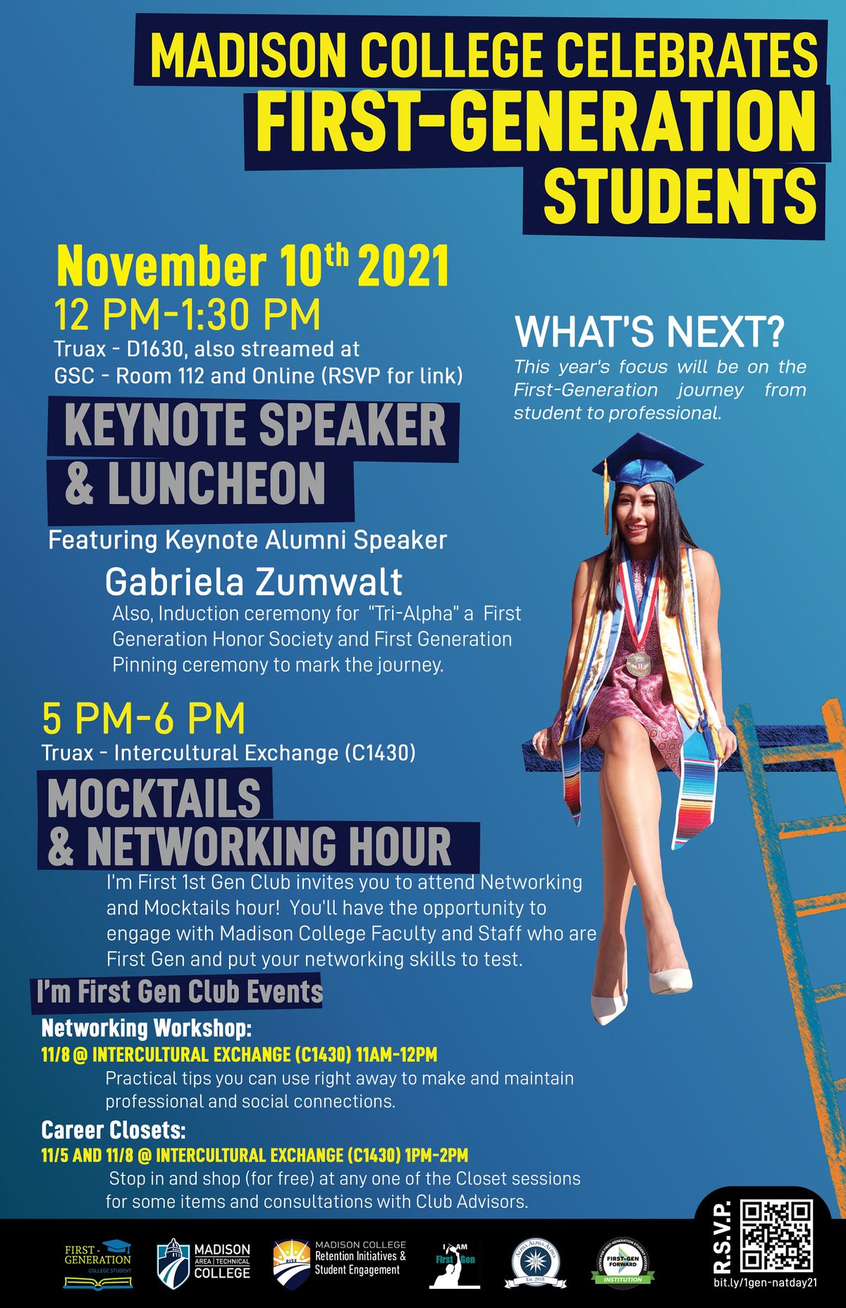 - Alumni keynote speaker, Gabriela Zumwalt, she will share her journey from First-Gen Student to First-Gen Professional