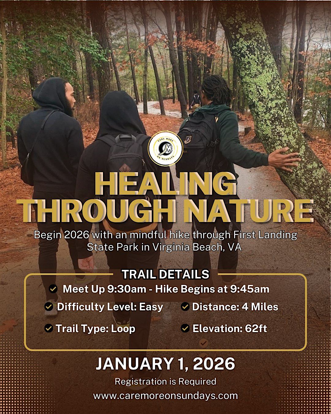 Begin 2026 grounded, present, and connected.Healing Through Nature is a guided, mindful hike hosted by Care More on Sundays at First Landing State Park. This experience invites you to slow down, reflect, and reset as you step into the new year surrounded by nature and community. The focus is on presence, mindful movement, & intentional reflectionnot.