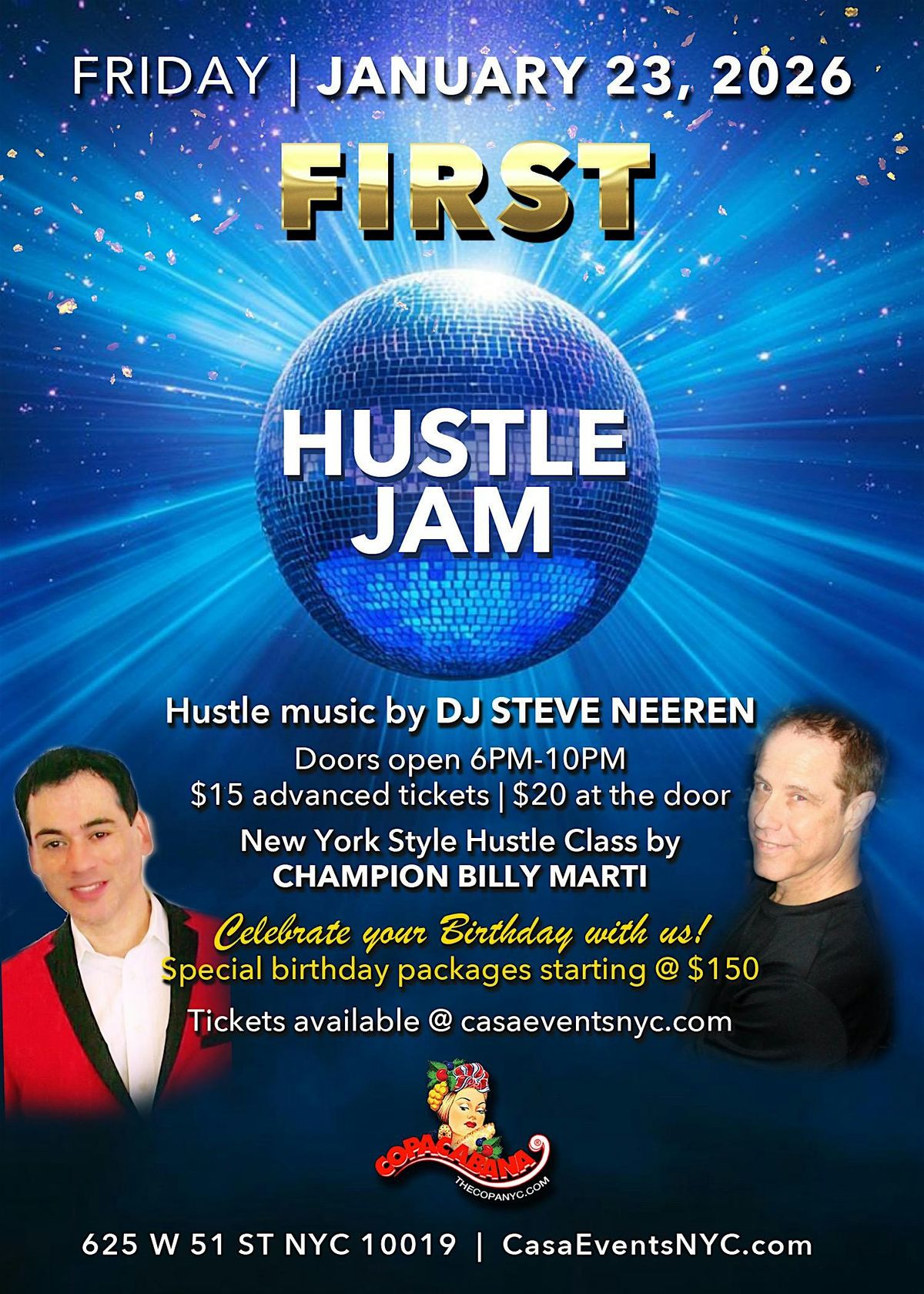 Kick off the new year on the dance floor at the First Hustle Jam of 2026! Join NYCβs Hustle community for an exciting evening of smooth rhythms, expert instruction, and vibrant energy inside The Copa NYC, one of the cityβs most iconic dance venues.