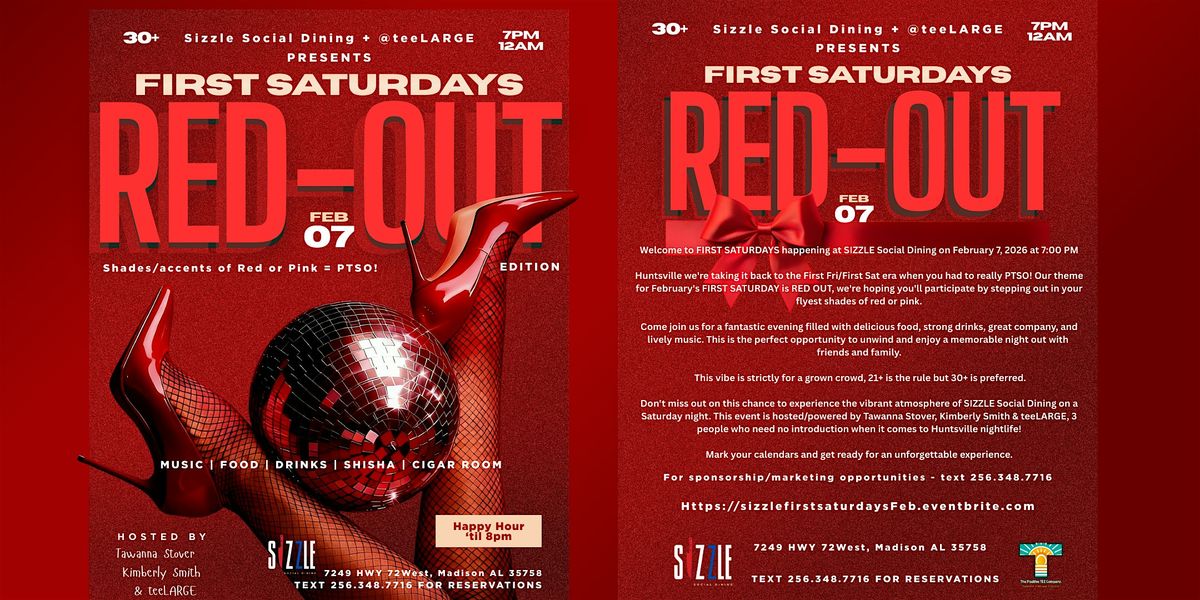 Don't miss out on this chance to experience the vibrant atmosphere of SIZZLE Social Dining on a Saturday night. This event is hosted/powered by Tawanna Stover, Kimberly Smith & teeLARGE, 3 people who need no introduction when it comes to Huntsville nightlife!