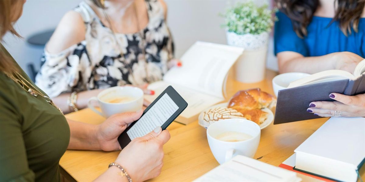 Image: People holding open books and an eReader seated around a table with coffee and snacks.