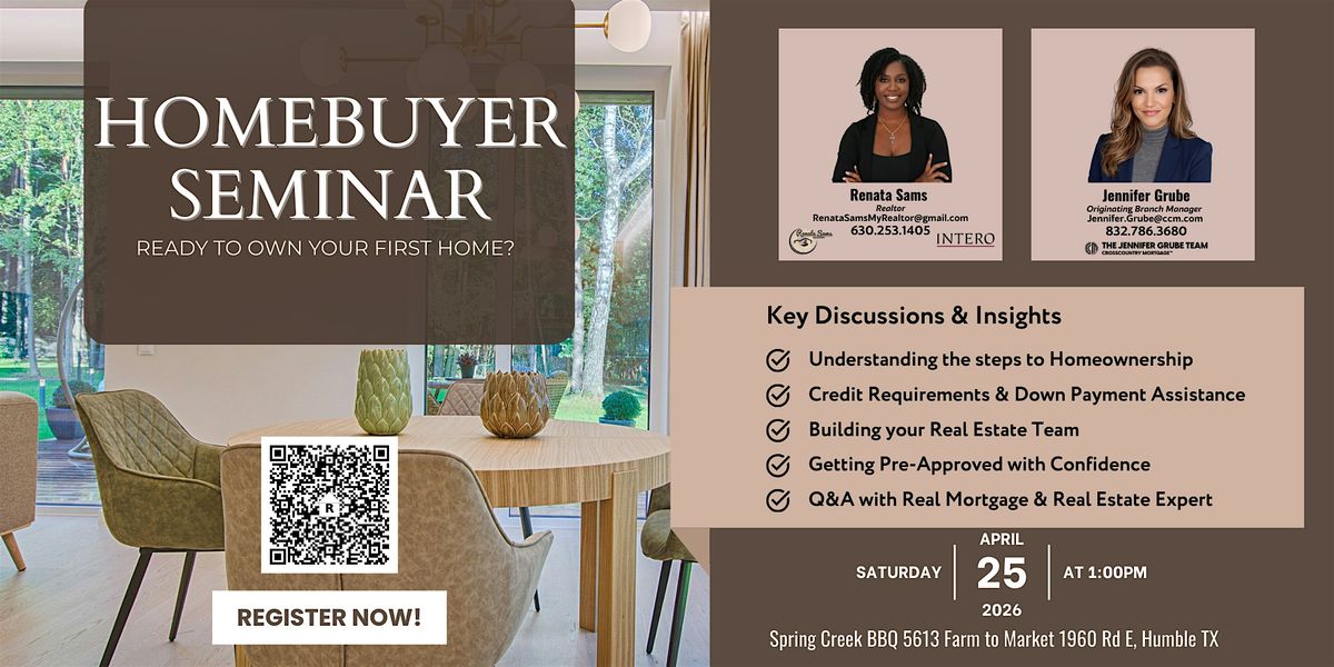 Join Renata Sams, Realtor, and Jennifer Grube, Mortgage Expert, for an informative First-Time Homebuyer Seminar designed to guide you through the entire homebuying process.
