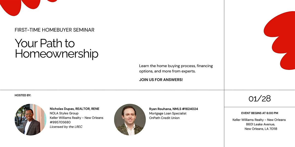 Ready to dive into the exciting world of homeownership? This in-person seminar is perfect for anyone looking to buy their first home. We'll cover everything from financing tips to navigating the buying process with ease. Bring your questions, bring a friend, and let's make your dream of owning a home come true!