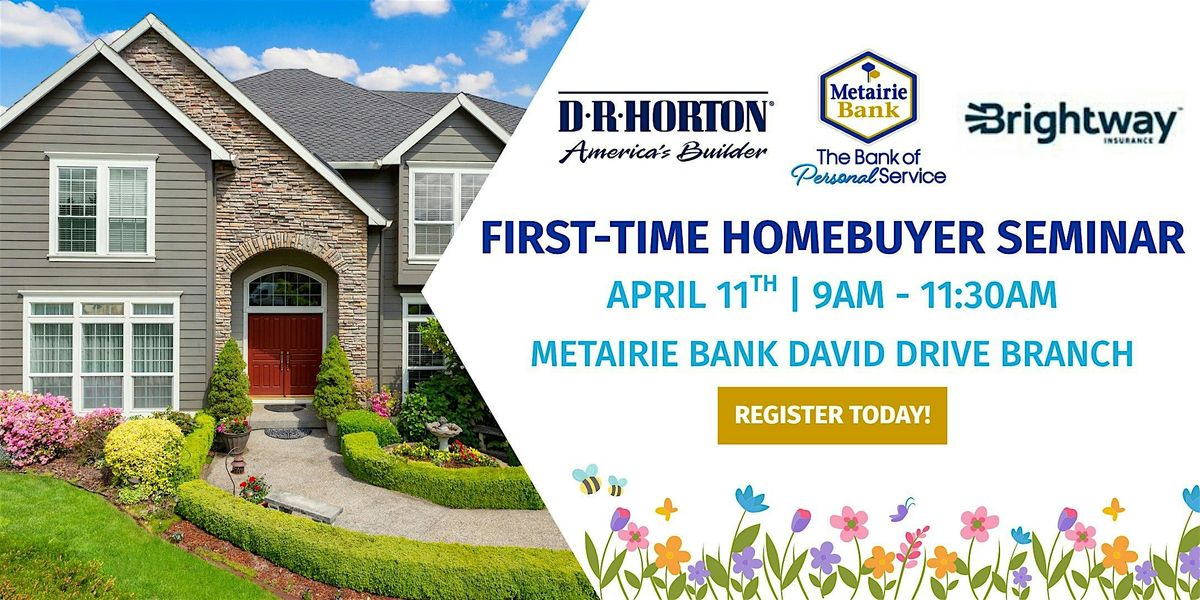 Join Metairie Bank, D R Horton, & Brightway Insurance on Saturday, April 11th, from 9 am - 11:30 am for a First-Time Homebuyer Seminar!About this Event