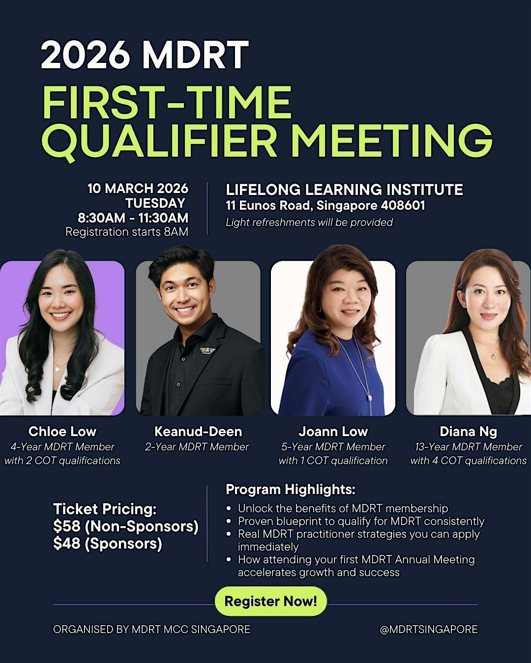 The meeting highlights how to unlock the true value of MDRT membership - from global recognition and credibility to powerful networking and learning opportunities. Learn how to qualify consistently through disciplined activity, strong prospecting systems and client-focused financial planning. MDRT practitioners will discuss practical strategies that can be implemented immediately to improve case size, client conversations and referral generation.