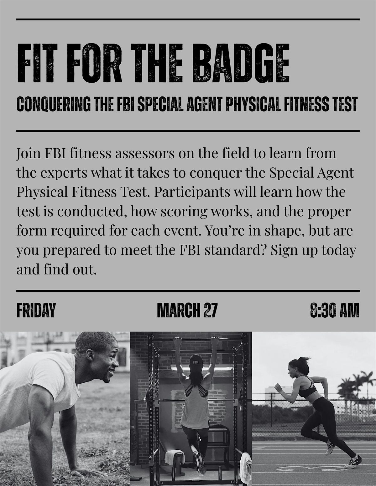 Disclaimer: Anyone who is actively in the FBI Special Agent application process is not permitted to attend this event. This event is only open to those interested in learning about the fitness requirements but are not actively in the testing process.