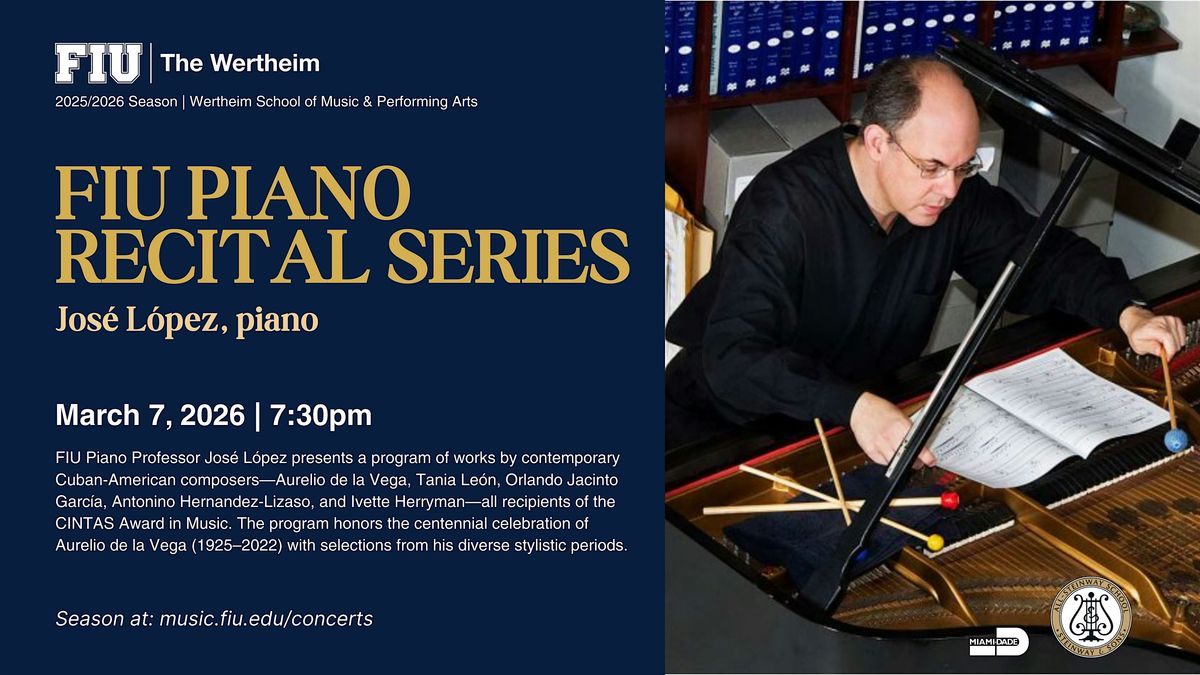 Join us at The Wertheim for an evening with FIU Piano Professor José López as he presents a program celebrating contemporary Cuban-American composers who have shaped today’s musical landscape. Featuring works by Aurelio de la Vega, Tania León, Orlando Jacinto García, Antonino Hernandez-Lizaso, and Ivette Herryman, the program spotlights artists who have each received the prestigious CINTAS Award in Music. The program also includes selected 19th-century composers, and the premiere of two short works by Gaspar Villate (1851-1891).