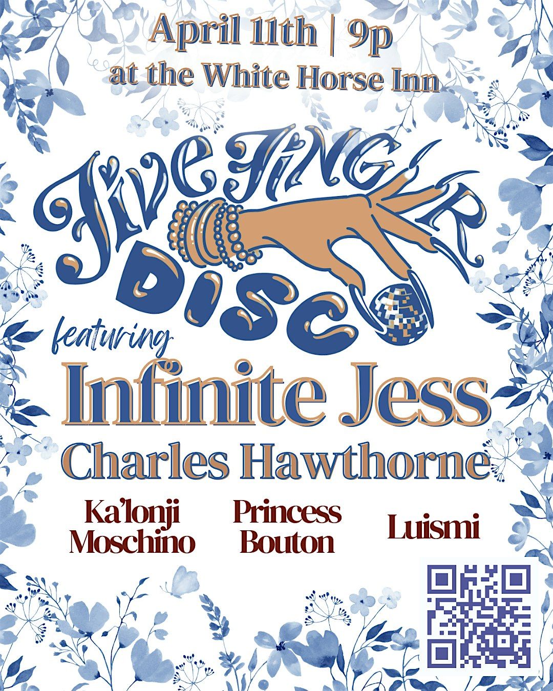 21+ with valid ID. Five Finger Disco celebrates the contributions of Black women and femmes in dance music and centers their experiences on the dancefloor. There is absolutely zero tolerance for racism, misogyny, transphobia, ableism, or being an asshole at FFD or the White Horse! Come correct, or don't come at all!