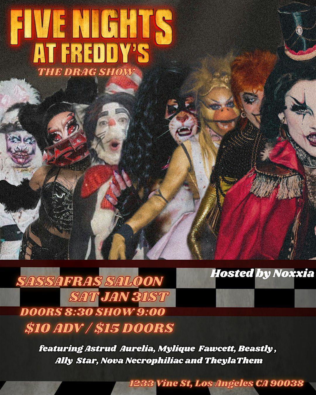 A Five Nights at Freddy's themed drag show hosted by Noxxia Datura and featuring Astrud Aurelia, Beastly, Mylique E. Fawcett, Nova Necrophiliac, Ally Starr, and Theylathem.
