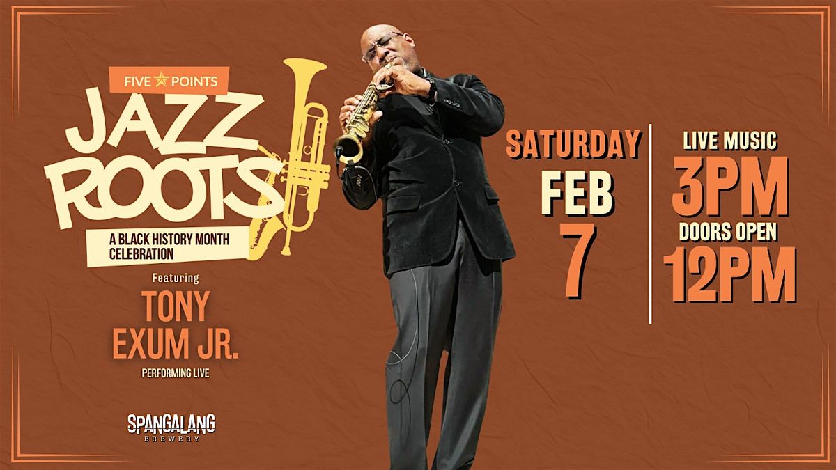 As part of Five Points Jazz Roots: A Black History Month Celebration, saxophonist Tony Exum Jr. brings his smooth, high-energy sound to Spangalang Brewery for an afternoon of live jazz on the Welton Corridor.