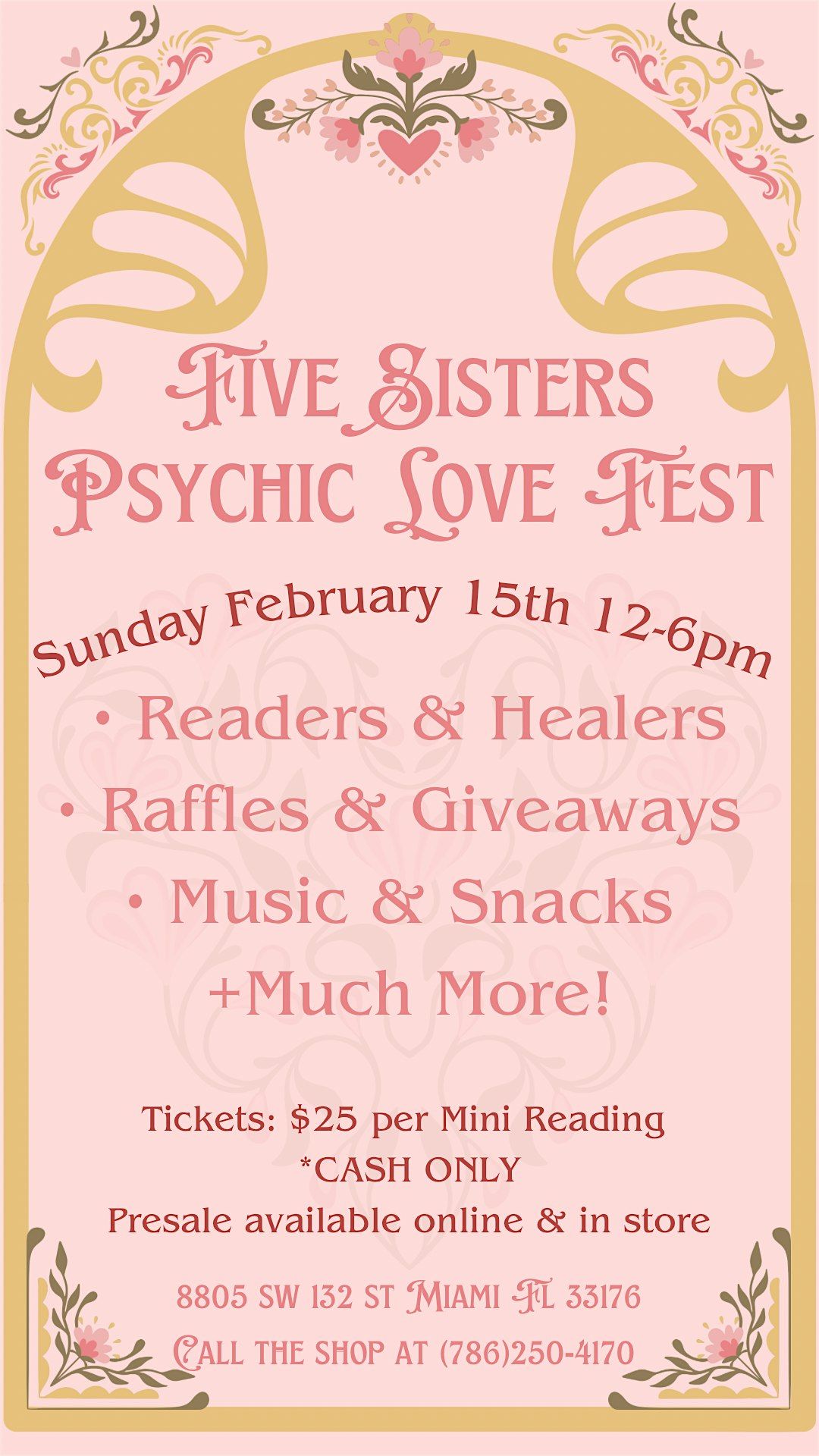 Join us for the first Five SistersPsychic Love Fest, a captivating event where you can explore the mystical world of psychics and spiritual advisors. Immerse yourself in an enchanting atmosphere at the Five Sisters location, where you'll have the opportunity to connect with gifted psychics, tarot readers, and clairvoyants, healers and more!
