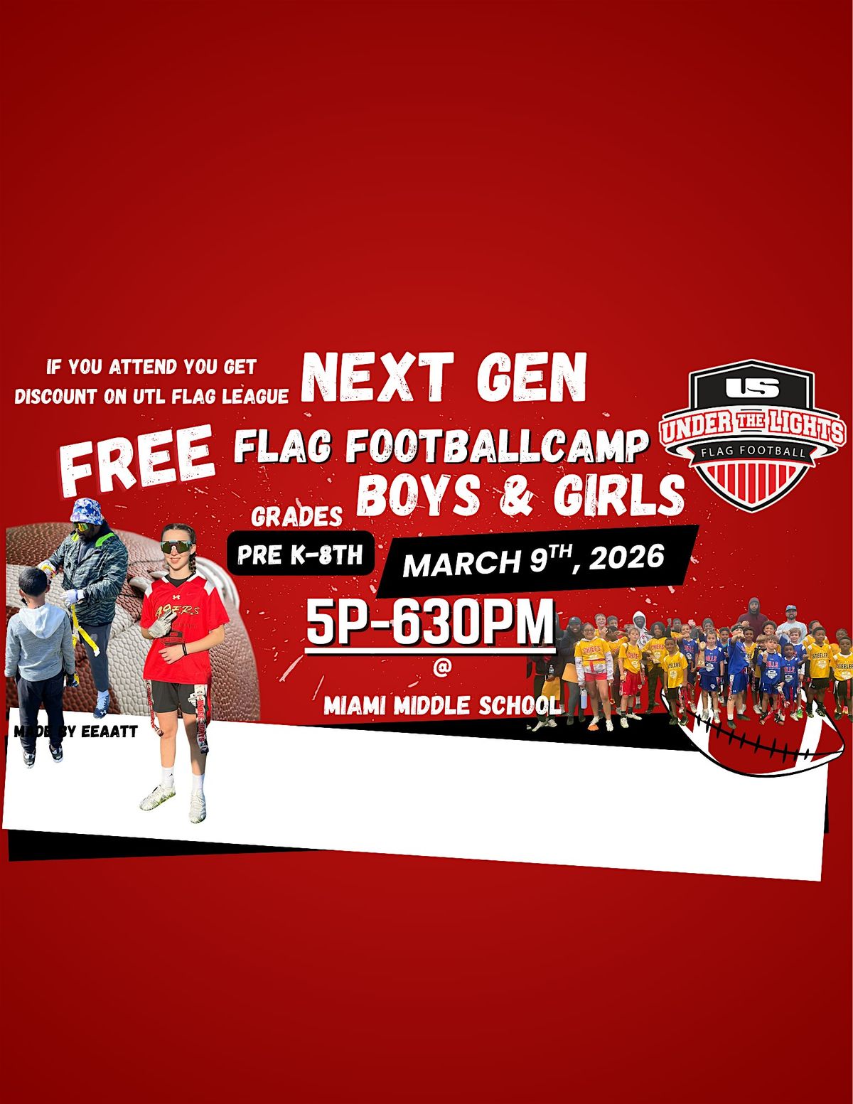 Join us for a fun Flag Football Camp at Miami Middle School! Whether you're new or want to sharpen your skills, this is the place to be. Mark your calendar for March 9, 2026 at 5:00 PM (EST). Come ready to play, learn, and have a great time with friends. Don't miss out on this awesome chance to get active and enjoy some flag football action!