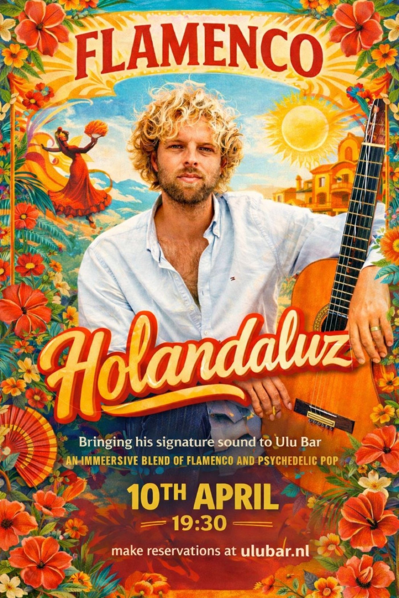 Holandaluz will be bringing his signature sound to Ulu Bar: an immersive blend of flamenco and psychedelic pop. Known for fusing traditional Spanish guitar techniques with modern pop structures, his music flows between rhythmic rumba grooves, atmospheric soundscapes, and progressive, story-like compositions. Expect a vibrant, genre-bending live set where flamenco meets dreamy, psychedelic energy in an intimate setting.