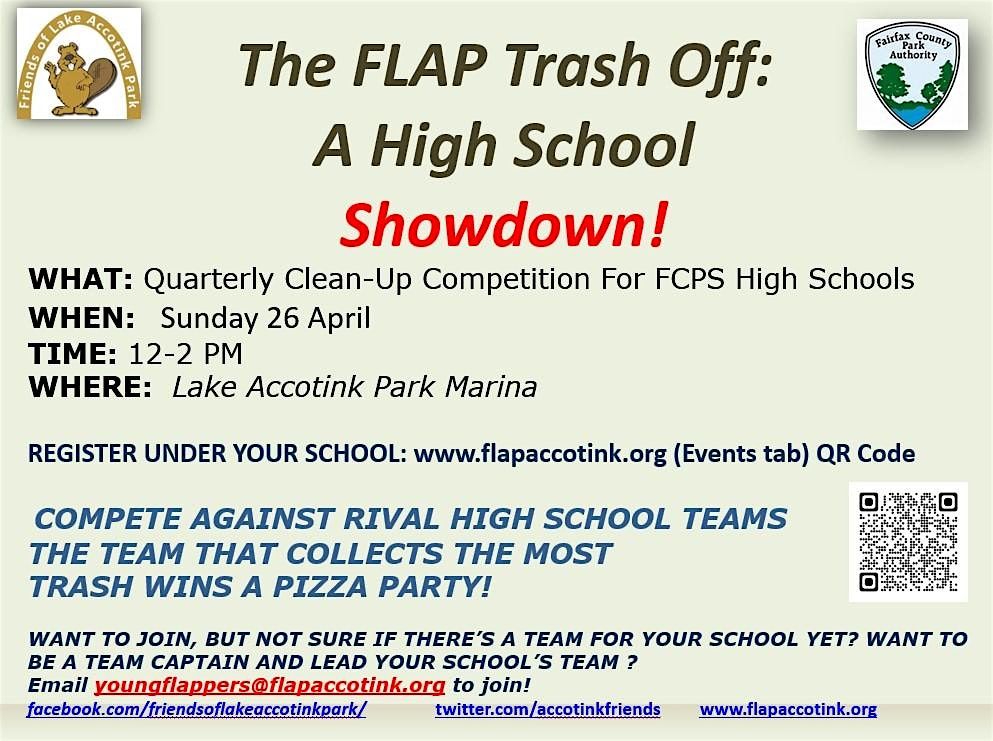Friends of Lake Accotink Park-FLAP host biannual Trash Challenges: A challenge given to many FCPS high schools; High School Showdown! Combined, volunteers comb 497 acres to collect trash within the two hour limit. Removing these harmful pollutes from the waterways and land not only improve the environments health but also the health of our wildlife. We will hold these challenges on a quarterly basis; highlighting the school recovering the most trash at each event. An annual winner will also be selected. A big thank you to all our volunteers and congratulations to our showdown winners!