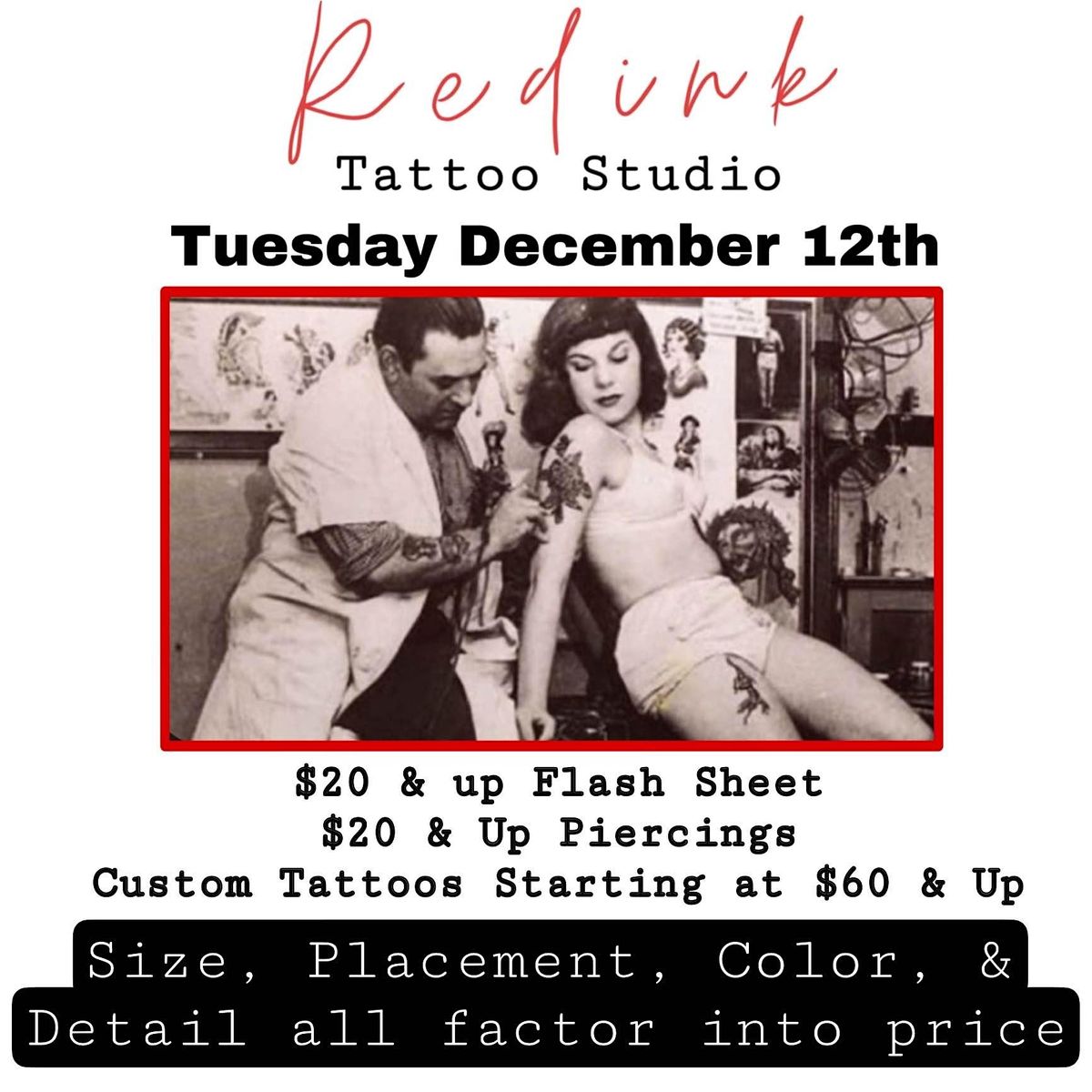 FLASH $20 & up tattoos and piercings and discounted custom tattoos $60 & up Tuesday December 12thAbout this Event