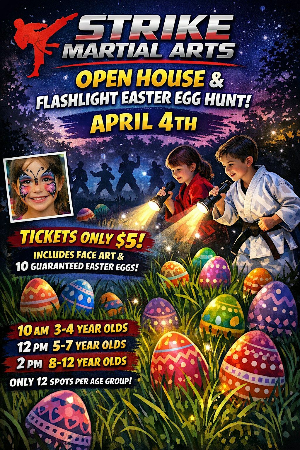 Bring your kids to Strike Martial Arts for a fun Open House and Flashlight Easter Egg Hunt on April 4th! Kids will explore the dojo with flashlights searching for hidden eggs, enjoy face art, and experience the excitement of martial arts in a high-energy environment. Every child is guaranteed 10 Easter eggs, and space is limited to only 12 participants per age group to keep the event fun and organized.