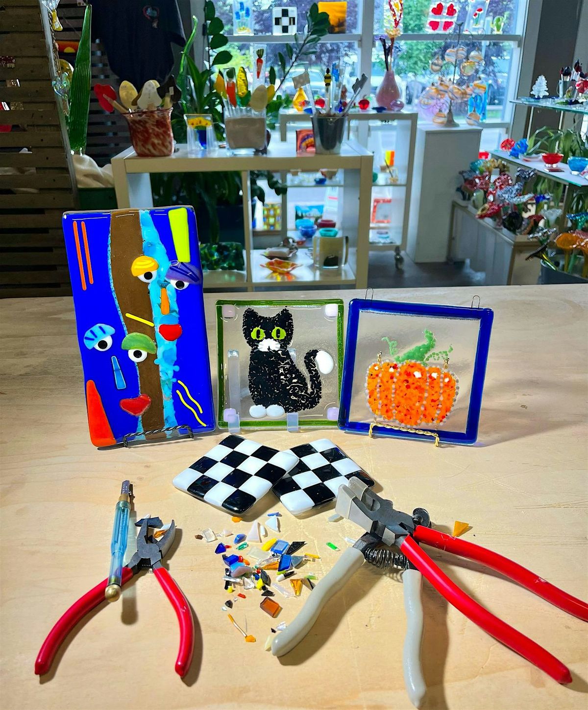 In this 2 hour class, our artist instructors guide you thru the design process, the glass prep, of cutting, nipping, edging, layout, proper portions, and even in this info, allow you to create, a hanging piece, a flat composition, coasters, plant stakes, etc. ..You decide in-studio which one you want to create..and we help you get to the end of your introductory fusing project.