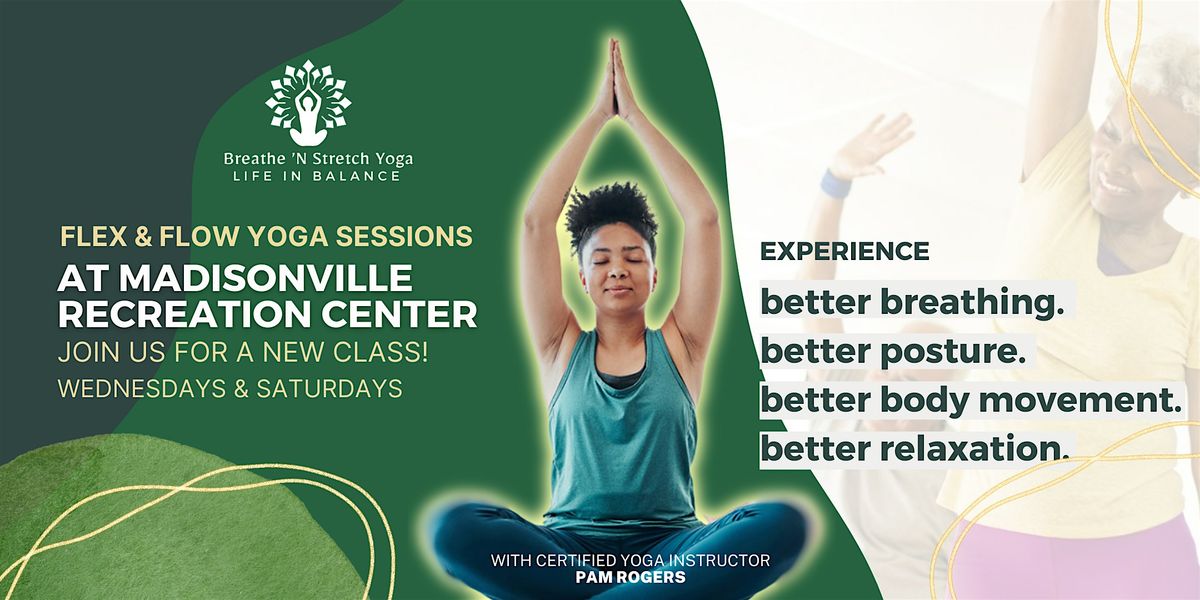 Welcome to the Flex & Flow Yoga Sessions at Madisonville Rec Center! Join our Beginner's yoga class Wednedsays (6 PM- 7 PM) & Saturdays (1 PM - 2PM).