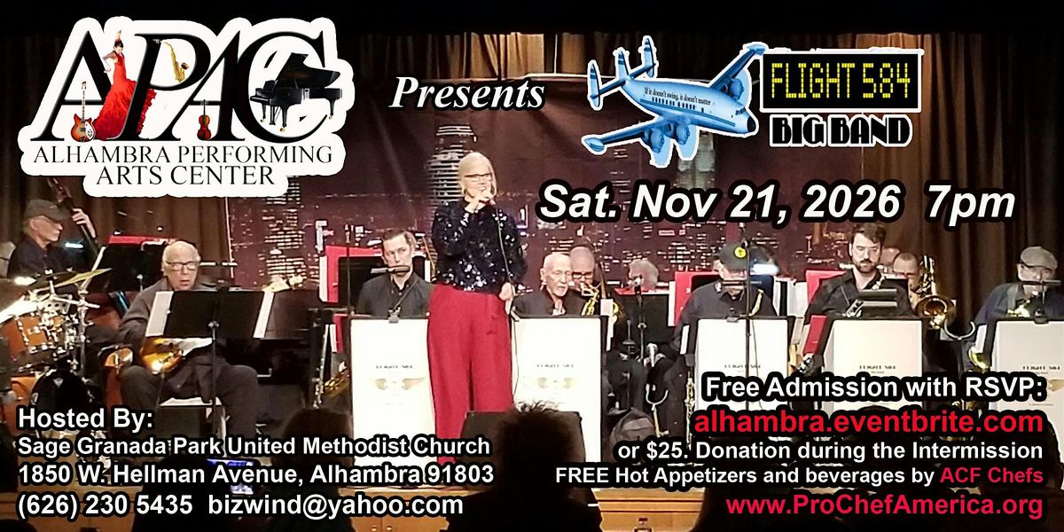 Join us for an electrifying evening with Flight 584 Big Band, a powerhouse ensemble directed by saxophonist John Mitchell, featuring five reeds, eight brass, and a four-piece rhythm section. This dynamic group brings to life the vibrant sounds of the Great American Swing tradition with arrangements by legends such as Sammy Nestico, Billy Byers, Bob Florence, Terry Gibbs, Bill Holman, Quincy Jones, Oliver Nelson, Mike Barone, Tommy Newsom, Tom Kubis—and many more.