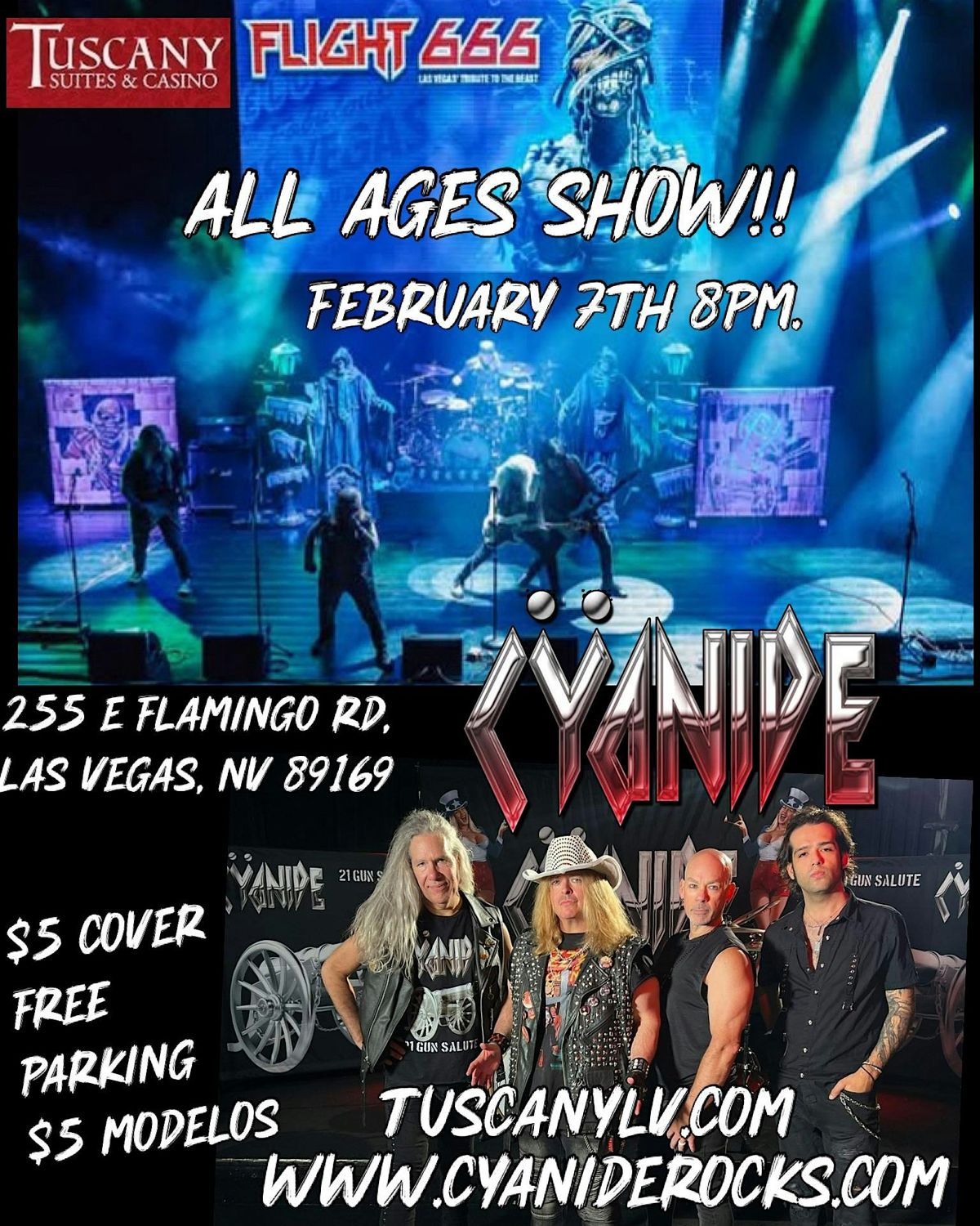 Get ready for a high-energy night of metal at The Copa Room featuring Flight 666 (Iron Maiden Tribute) and Cyanide. Enjoy free parking, $5 Modelos, and powerful live performances that bring classic metal to life. Don’t miss this epic night of loud riffs and heavy atmosphere.