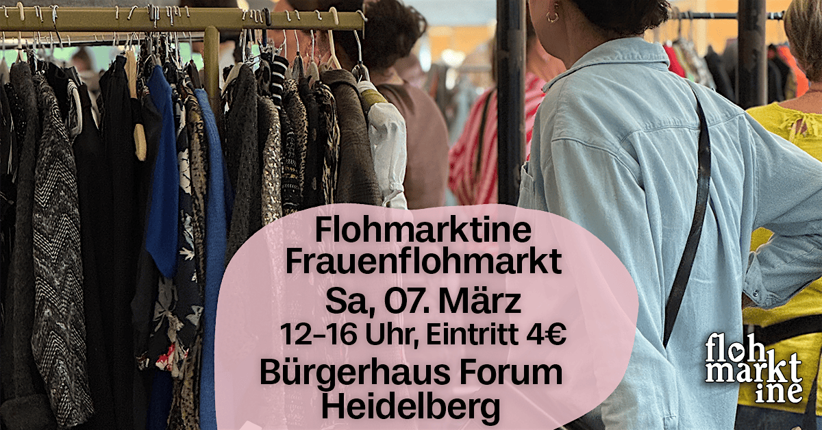 Samstag, den 07. März in Heidelberg!🫶✨ Flohmarktine Frauenflohmarkt, das nachhaltige Shoppingevent im Bürgerhaus Forum in Heidelberg (Emmertsgrund)!🛍️🌿 Du liebst Kleidung, Vintage & Accessoires? Bei uns gibt es alles, was dein Frauenherz begehrt!🫶