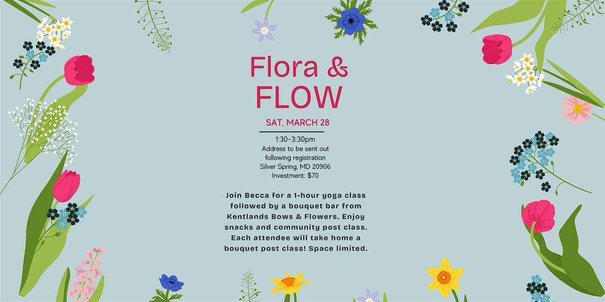 Info: Following our yoga class, we'll have a hands-on bouquet bar where you'll arrange your own take home blooms from Kentlands Bows & Flowers. Light snacks will also be provided - you bring the good energy and friends and we'll take care of the rest.