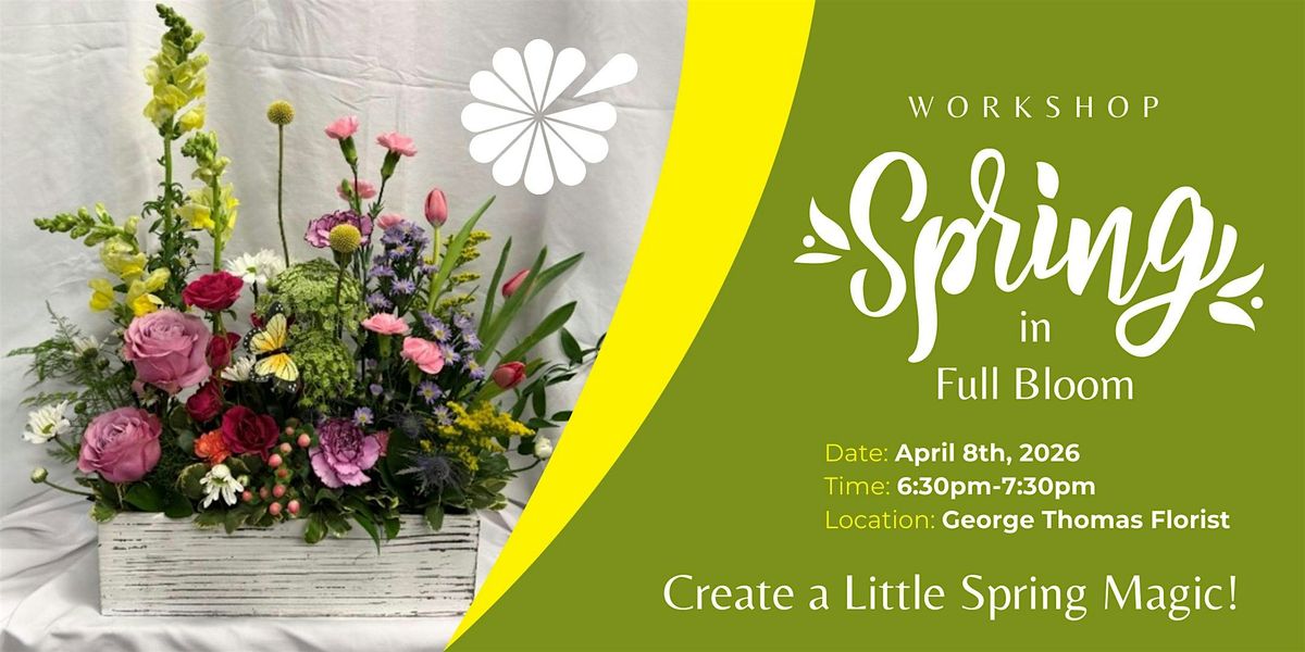 Join us for a Spring Floral Workshop at George Thomas Florist, where you’ll create a beautiful seasonal arrangement using fresh, colorful blooms. During this hands-on class, our floral designers will guide you step by step as you design a cheerful spring arrangement featuring snapdragons, roses, carnations, and tulips arranged in a charming distressed white-washed wooden container.