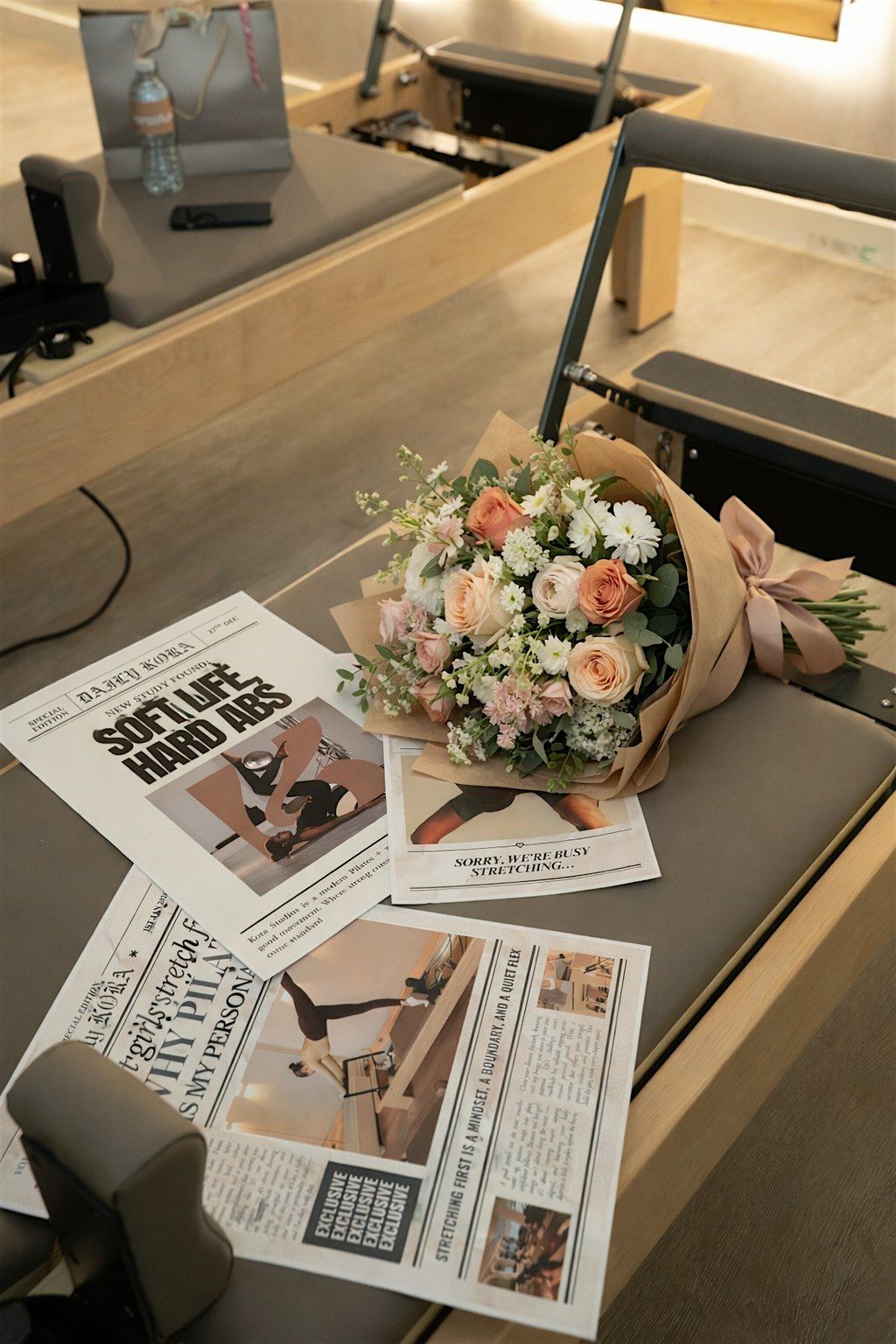 Join us at Kora for Flow & Flowers — a gentle, beginner-friendly reformer flow, time to connect over refreshments, and a guided bouquet workshop with @zee.florals 🌸