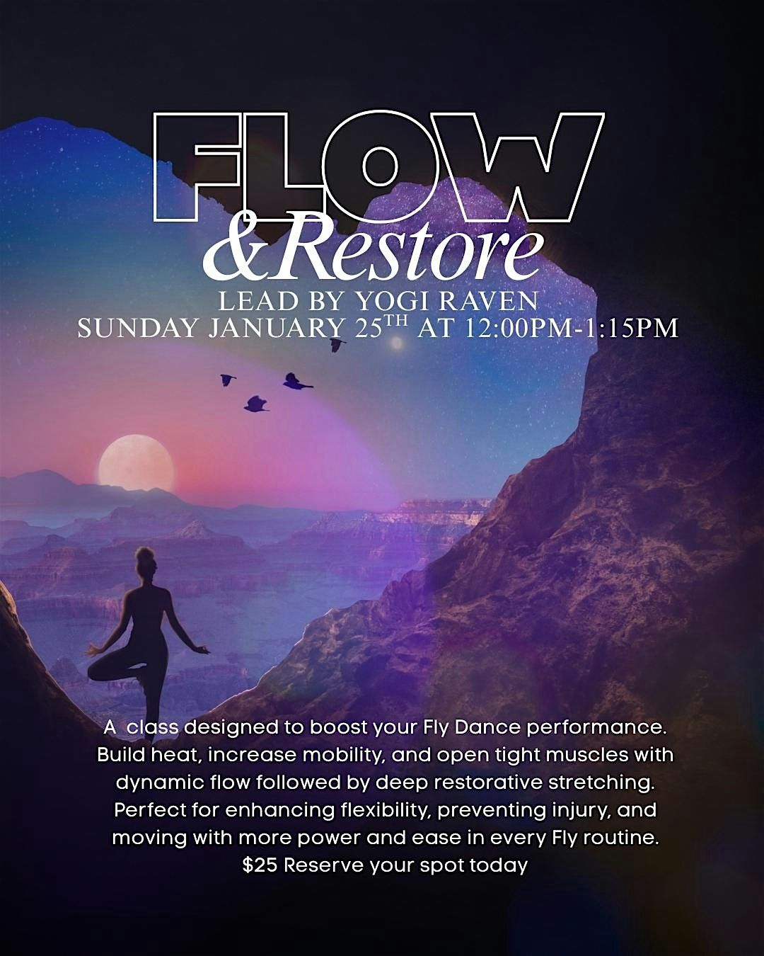 Get ready for a 75-minute Flow & Restore experience designed to supercharge your Fly Dance training. This class blends dynamic vinyasa sequences with deep, targeted stretches that unlock mobility, increase flexibility, and create the long, strong lines dancers need. You’ll warm the body, open the hips, lengthen the spine, and restore the muscles you push hardest in Fly routines—so you move with more power, more fluidity, and zero tightness holding you back. Flow & Restore is the secret weapon that keeps dancers flexible, injury-resistant, and performing at their absolute best.