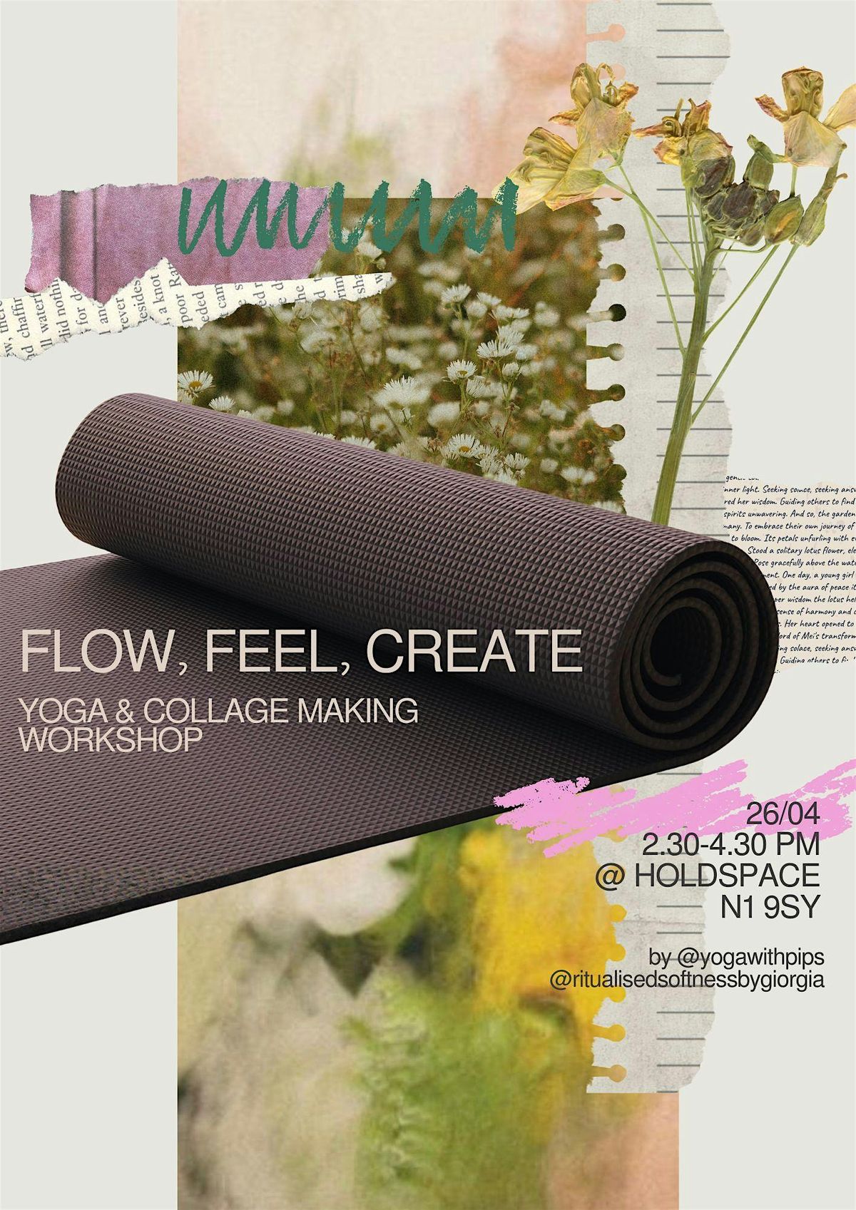 A safe space open to everyone — beginners welcome for both yoga and collage. No artistic experience needed.