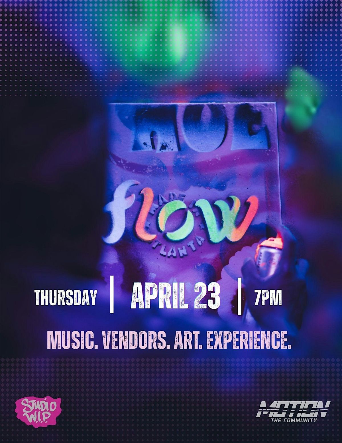 Every Flow is different! We focus on a core experience that changes with each event. This experience features, GLOW - the Glow in the Dark Spray Paint experience by Studio W.I.P.