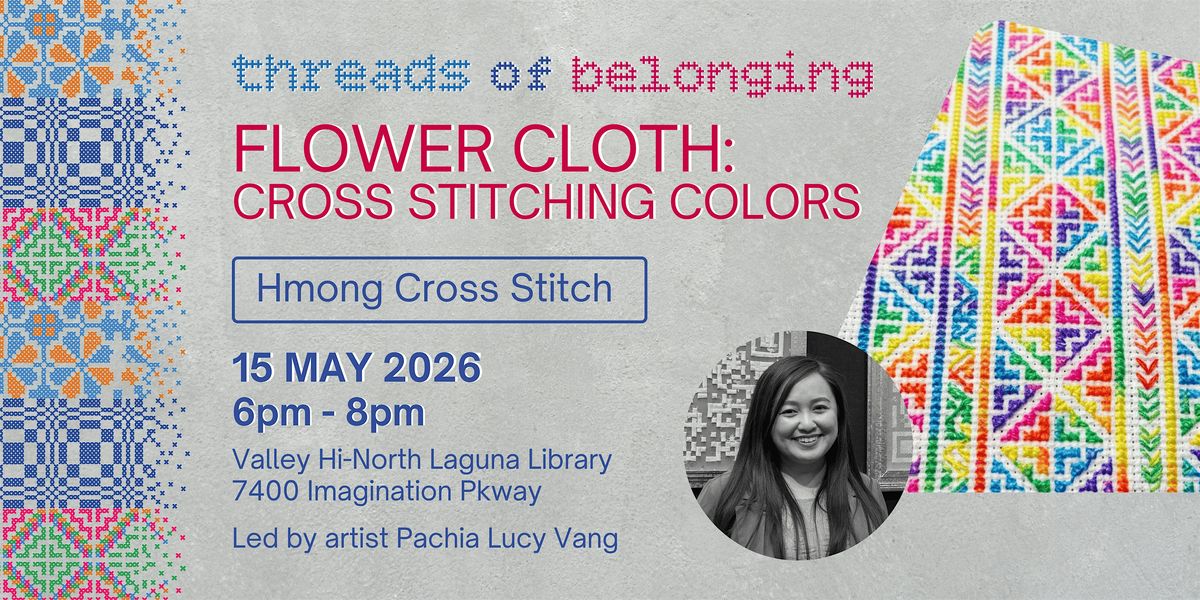 The Threads of Belonging mural centers the Hmong “house” motif—a symbol of family, memory, and the longing for home felt across the diaspora. In this workshop, we transform rainbow colored thread into “flower cloth,” exploring the vibrant color, pattern, and texture of traditional Hmong needlework. Whether you’re new to stitching or experienced, this is a relaxed environment to learn, experiment, and connect.
