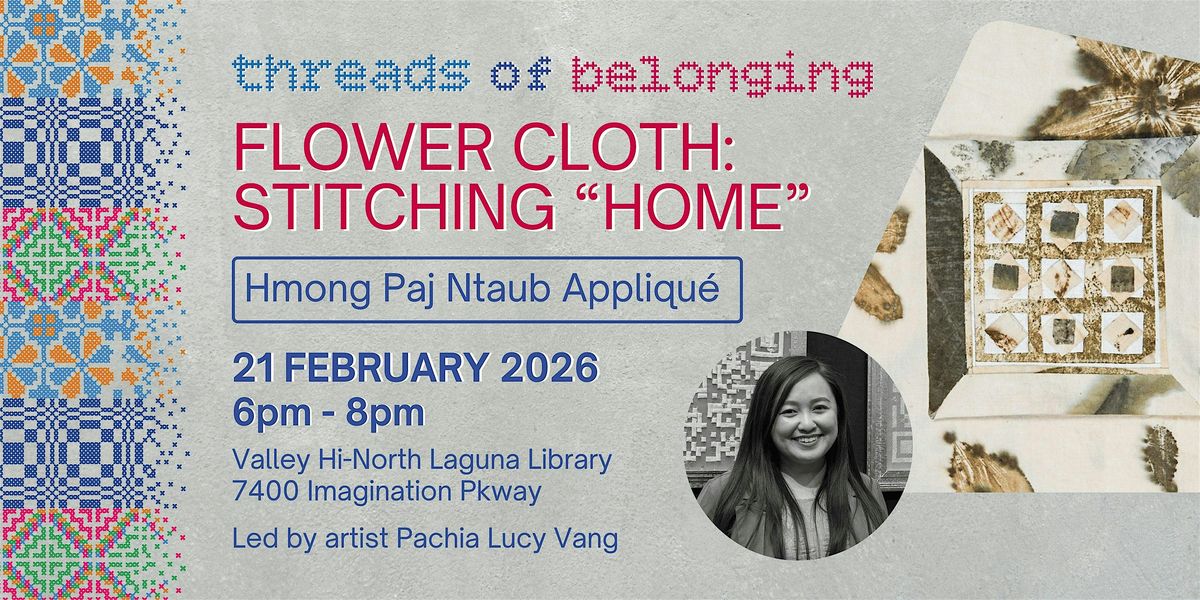 The Threads of Belonging mural features the HMong "house" motif—a symbol of family, memory, and the longing for a sense of “home” felt across the diaspora for a displaced people. In this workshop, we turn locally grown flowers into "flower cloth," grounding "paj ntaub" in their home here, and transforming petals into small appliquéd houses that echo the motif on the mural. Rooted in the communal spirit of paj ntaub, this hands-on session invites us to sit and stitch together slowly—remembering, imagining, making, and re-making what the HMong "house" can hold.