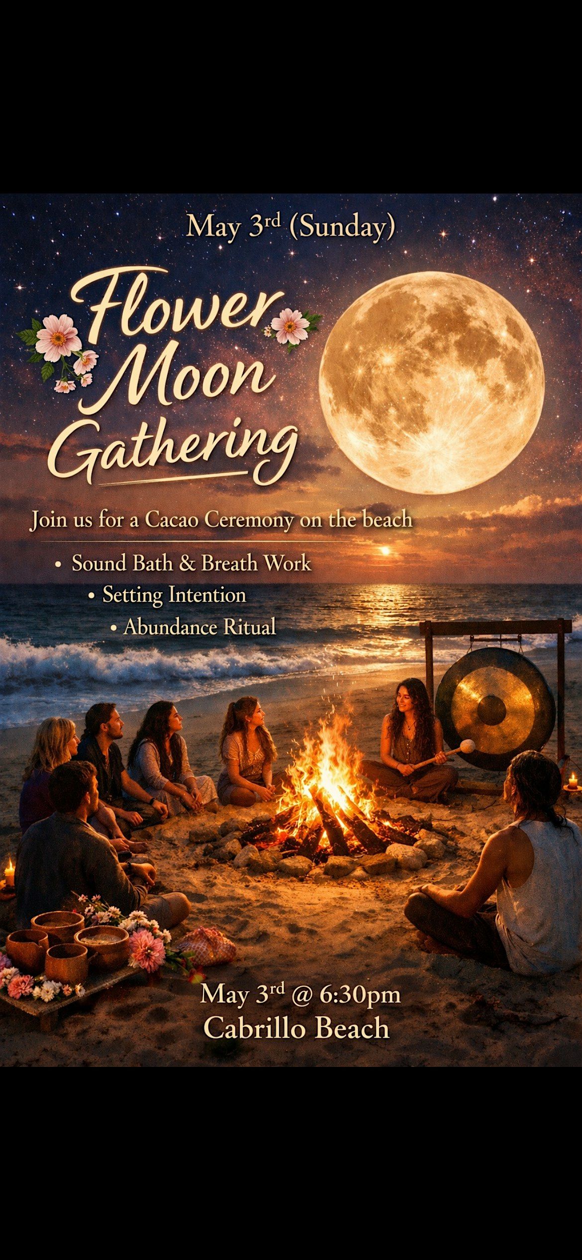 Join us for a sacred evening of connection under the flower moon. We will start with an intention setting abundance ritual to invite what we want to blosom in our lives. Following we will dive into enjoying some heart opening cacao brought back from lake Atitlan Guatamala while receiving reiki blessings. After sharing the cacao, you will be invited to relax and enjoy the healing vibrations of a sound bath next to the warmth of the bonefire.
