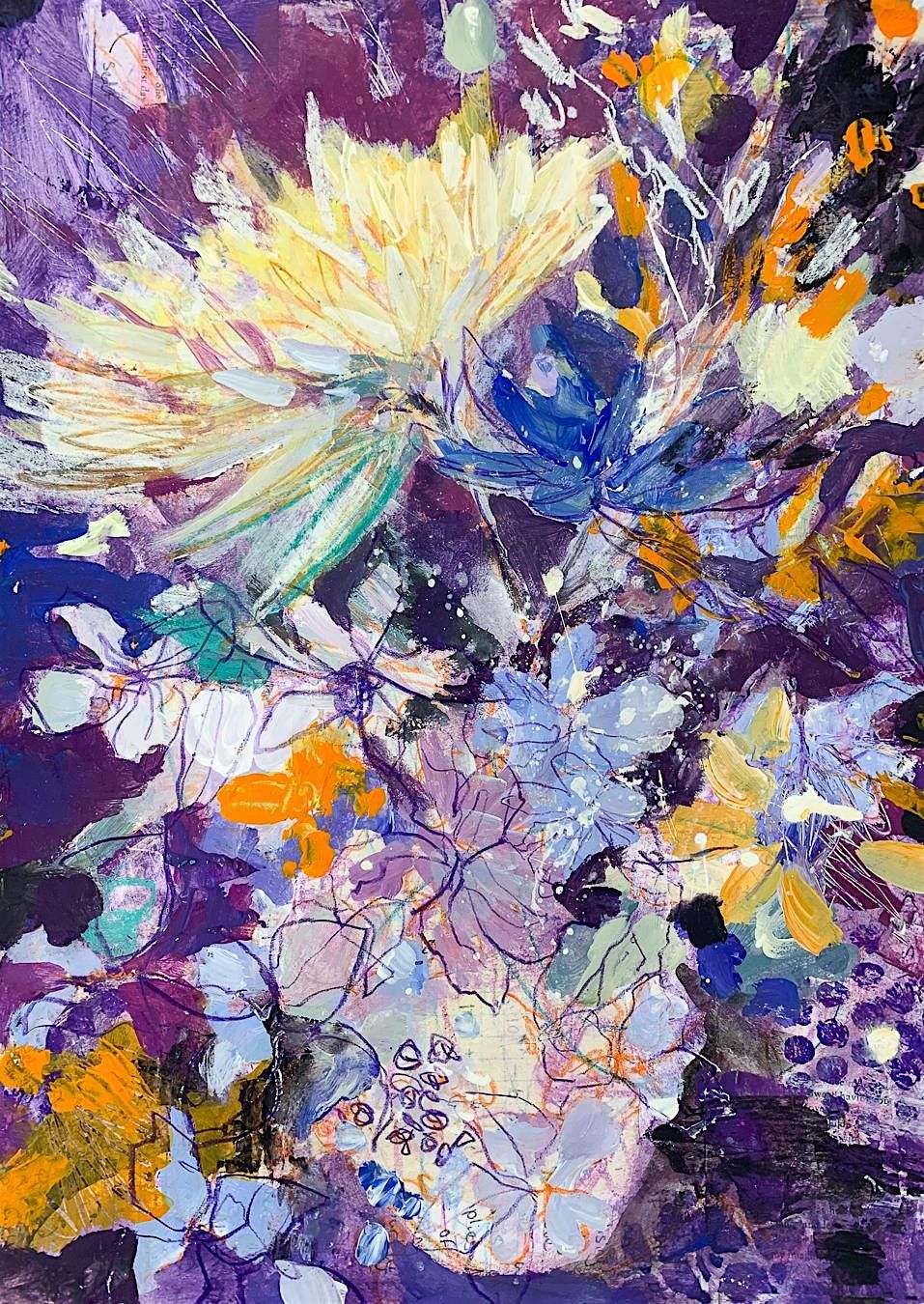 This painting was created by a beginner, with no prior art knowledge or background in painting. The floral display was the inspiration and starting point. It was completed within a 2- hour session earlier this year.