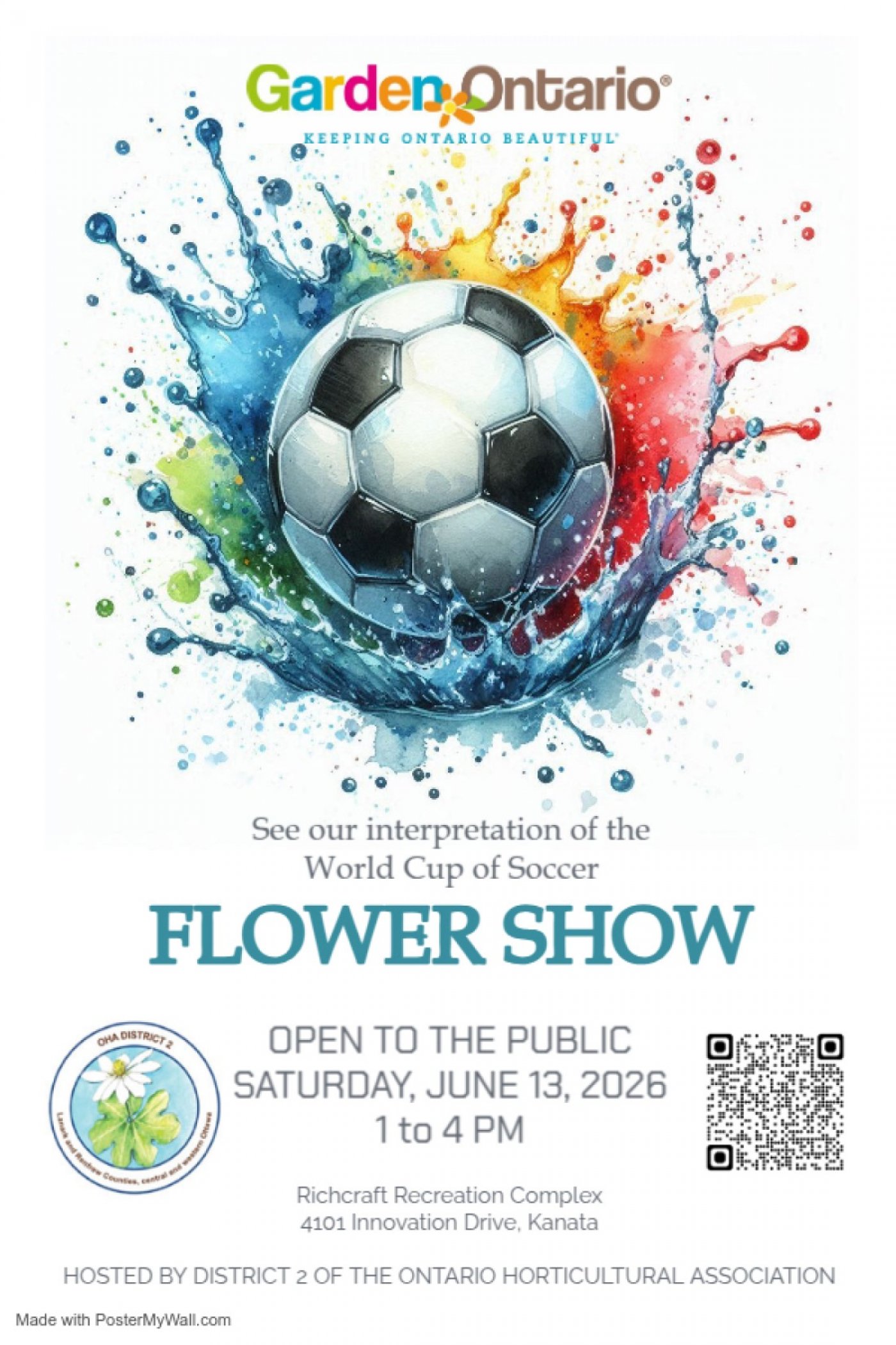 Welcome to the LARGEST FLOWER SHOW in Eastern Ontario. Enjoy the horticulture specimens -- see new varieties of flowers, learn their names or simply enjoy their beauty. Contemplate the creative design energy of our members in their interpretation of this year's show theme WORLD CUP COMES TO CANADA! Kids can enter the youth section of the show and win prizes. On the day of the show, there will be a kid's activity for them to take home. This show is free to the public.